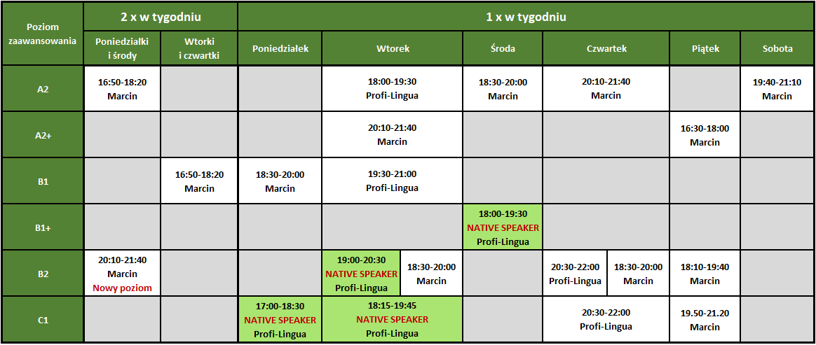 - Poziomy zaawansowania A2, B1, B2, C1 w częstotliwości raz oraz dwa razy w tygodniu.